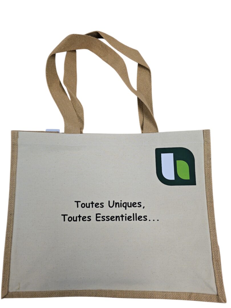 En jute laminé, avec devant en toile et anses